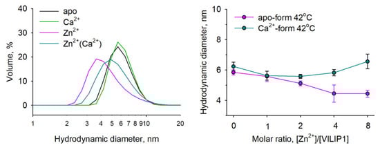 Figure 6. Zn2+-dependent dissociation of dimeric VILIP1. Hydrodynamic diameter of VILIP1 at 42 °C was assessed by DLS. Left panel: representative size distribution curves for VILIP1 in the presence of saturating concentration of Ca2+, Zn2+, both (“Zn2+(Ca2+)”, or neither (“apo”). Right panel: mean hydrodynamic diameter values for apo- and Ca2+-bound VILIP1 in the presence of increasing Zn2+ concentrations. Standard error bars were plotted as a result of three independent measurements.