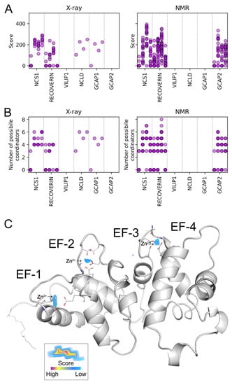 Figure 7. Complementarity of EF-hands to zinc ions estimated based on NMR and X-ray crystal structures of NCS proteins presented in PDB. (A) Diagram illustrating the maximum sum score for Zn2+ binding in EF-hands 1–4 (left to right) in each NCS protein. The data are presented as semi-transparent dots (magenta) that increase in intensity upon superposition. Zero score indicates “no binding”. The absence of points on the plot indicates the lack of a respective structure in PDB. One coordinator can contribute up to 100 units. (B) Number of potential coordinators in a maximum sum score point. Each atom (e.g., OD1/2 in aspartic acid) was counted independently. (C) NMR structure of recoverin (PDB ID 1JSA, model 1) with putative Zn2+-binding areas in EF1–EF3 (Zn2+). The contributing residues are shown as stick-like offshoots. Density of putative positions of Zn2+ is visualized as volumetric data, from low (blue) to high (red) values. The highest scoring area is typically located at the middle of the density (the inset).