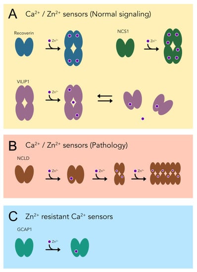 Figure 8. Categorization of NCS proteins based on Zn2+-binding properties. (A) Physiological Ca2+/Zn2+ sensor proteins, which bind zinc with high affinity and transform into a new functional state. (B) Pathological Ca2+/Zn2+ sensors responding only to aberrantly high free zinc concentrations by denaturation and aggregation. (C) Zn2+-resistant, Ca2+ sensor proteins. Zinc ions are shown as purple circles.