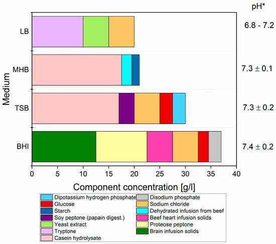 For antimicrobial activity testing the following complex culture media were used: Luria Bertani Broth (LB) (BioShop, Burlington, ON, Canada), Mueller Hinton Broth (MHB) (with 2.741 mg Ca2+/L and 5.282 mg Mg2+/L) (Oxoid, UK), Trypticase Soy Broth (TSB) (Biomaxima, Lublin, Poland) and Brain Heart Infusion Broth (BHI) (Oxoid, Basingstoke, UK). The composition of tested media is presented in Figure 1. All media were prepared according to the producer guidelines as non-diluted or 1:1 diluted with sterilized distilled water as it was proposed elsewhere [19]. The dilution process was applied to decrease the number of media components that were able to interact with tested ions.