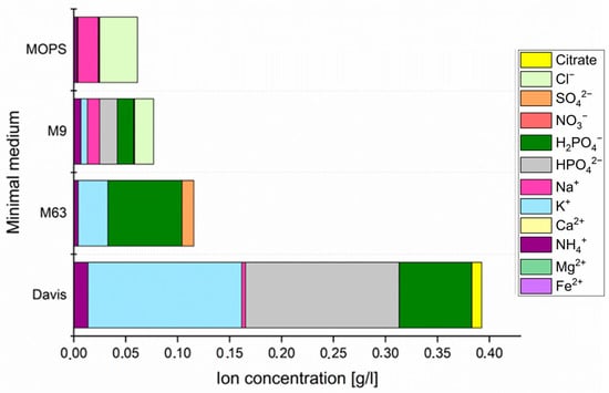 Moreover, four minimal (synthetic) media were chosen for the analyses. The components that were used to prepare MOPS, M9, M63 and Davis media are listed in Table S1, and the content of particular components is compared in Figure 2. All media were prepared according to the previously reported guidelines and pH of all minimal media was set at 7.2–7.4 using 10 M NaOH solution.