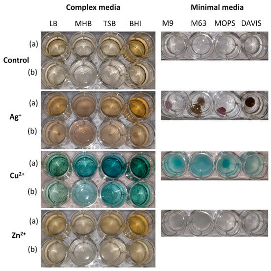 Colour changes and precipitates observed in different media (complex and minimal) mixed with Ag+, Cu2+, and Zn2+: (a) non-diluted medium, (b) 1:1 diluted with water.