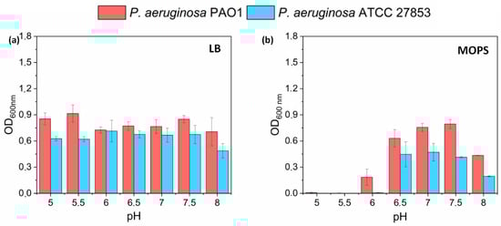 pH-dependent growth of P. aeruginosa PAO1 and ATCC 27853 strains in (a), LB (b), MOPS medium (mean ± sd, n = 3; for statistical analysis see Supplementary Materials Table S3).