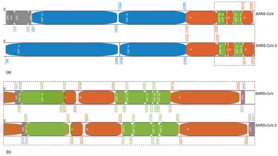 Open reading frames (ORF) organization in SARS-CoV-2 (GenBank: MN908947.3) and SARS-CoV (GenBank: AY394850.2) (a) The genome organization in complete sequence. (b) The enlarged diagram shows ORFs (no less than 75 nt in length) in SARS-CoV-2 and SARS-CoV genomes after 25,000 nt in sequence.