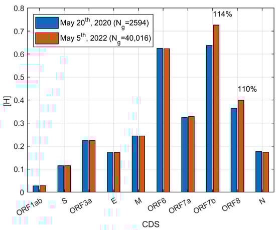 The mean HGS of ORF 7b and ORF 8 increased to 114% and 110% from 20 May 2020 to 5 May 2022. The HGS of other ORFs remained at almost the same level.