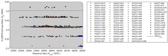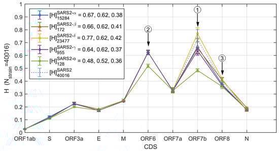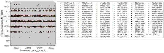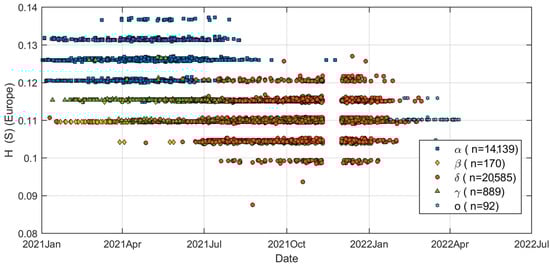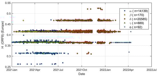 Although the results show that the HGS of SARS-CoV-2 has increased during the last 2 years, many of the important details are yet to be uncovered. The SARS-CoV-2 variants may have had quite different HGS variations during the last 2 years. Data from all 40,016 virus strains were analyzed to obtain a more detailed picture of changes in HGS in the SARS-CoV-2 genome. In particular, changes in HGS over time are of concern. Figure 4 shows the HGS of ORF 8 gene vs. time for five different variants with a geolocation of Europe (35,875 genomes). Amazingly, the HGS distribution has a special pattern, forming five distinct horizontal lines. The data clearly demonstrate that the Delta variant overwhelmed other variants since mid-2021. The HGS data points of Beta and Gamma are basically concentrated on the third and fourth lines (from low H to high H). The HGS data points of the Omicron variant are mainly at the third line from low to high. Omicron variant has HGS values comparable to the average level of the Alpha variant, but much lower than Delta. However, due to small amount of data, detailed analysis of Omicron variants remains to be completed.