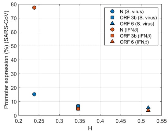 To quantitatively analyze the effect of these viral proteins on inhibiting interferon signaling and synthesis, the data on expression of ISRE promoter in cells transfected with SARS-CoV were analyzed. In the work of Kopecky-Bromberg et al. [25], the cells were transfected with plasmids expressing individual SARS-CoV proteins (ORF 3b, ORF 6 and N) and then infected with Sendai virus or treated with IFN-β 24 h after transfection. Both interferon synthesis and signaling are required to express ISRE promoter if cells are infected by Sendai virus. However, in IFN-β-treated cells, the expression of the ISRE promoter requires only interferon signaling. Cells transfected with empty vector plasmid are used as a negative control. The expression of ISRE promoter are percentages of the value for the empty control. We calculated the HGS of ORF 3b, ORF 6, and N for SARS-CoV.