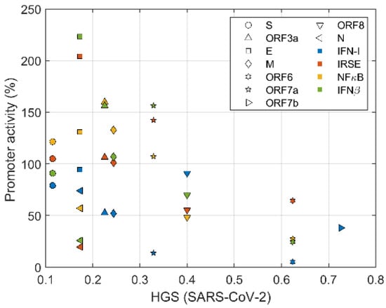 The relation between IFN inhibition of ORF proteins and HGS is examined here (Figure 9) The relative activity of promoter was normalized with the treated empty vector control value was set to 100%. Remarkably, there is a clear correlation between the suppression of IFN by viral proteins and HGS. The antiviral promoter activity of immune system decreased with the increase of HGS. These findings confirmed that HGS, i.e., similarity between virus and host genome, is a reliable indicator of the suppression of innate immunity by viral proteins.