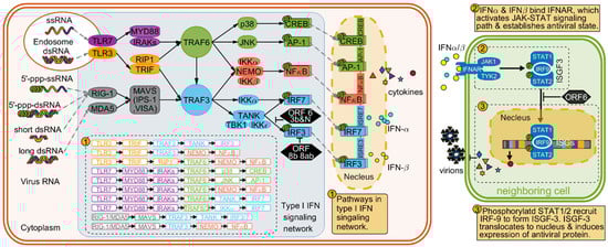 For coronavirus with RNA genome, TLR3 and TLR7 are the two most important TLR receptors which induce innate immune response through the MyD88 and TRIF signaling pathways [31,37,75,76,77,78,79,80,81,82,83]. Figure 10 shows the signaling networks from detecting virus RNA to secreting type I IFN. The intracellular cytosolic RLRs consists two important members: retinoic acid inducible gene I (RIG-I) and melanoma-differentiation-associated protein 5 (MDA5). RIG-I mainly detect short RNA with 5′ triphosphate [84,85,86]. MDA5 recognizes large size RNAs and RNAs with cap structures lacking ribose 2′-O-methylation and long dsRNAs [87,88,89,90]. The produced IFNα/β are released out of cell and bind to the interferon-α/β receptor (IFNAR) located at cell surface (Figure 10), helping to establish an antiviral state in threatened cells.