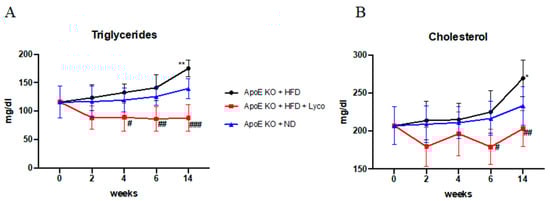 Male ApoE−/− mice were fed with a normal diet or HFD for 14 weeks; the HFD animals were treated daily with either the vehicle or lycopene starting from week 3 and up to week 14. The HFD group showed a significant increase in both triglycerides and cholesterol levels at week 14 compared to the normal diet group. The lycopene treatment significantly reduced the triglyceride levels in the blood of the mice fed with HFD from week 4 (p < 0.05 vs. HFD; Figure 1A), showing a decrease in triglycerides during all the experimental periods (p < 0.0001 at the end of experiment vs. HFD; Figure 1A). Moreover, the lycopene administration significantly reduced cholesterol levels in the blood from week 6 to the end of the experiment (p < 0.05 at week 6 vs. HFD; p < 0.001 at week 14 vs. HFD; Figure 1B).