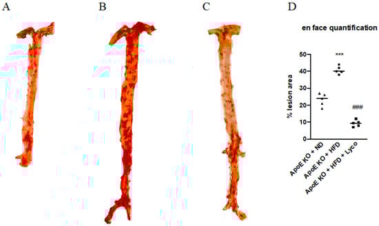 Effects of Lycopene on percentage of lesion surface area in aortas samples stained with oil-red-o from ApoE KO + ND (A), ApoE KO + HFD (B), and ApoE KO + HFD + Lyco (C) groups. The graph in (D) shows the quantification of the percentage of atherosclerotic plaque surface area. Values were obtained from 5 animals per group and are expressed as the means ± SD. *** p < 0.0001 vs. ApoE KO + ND; ### p < 0.0001 vs. ApoE KO + HFD.