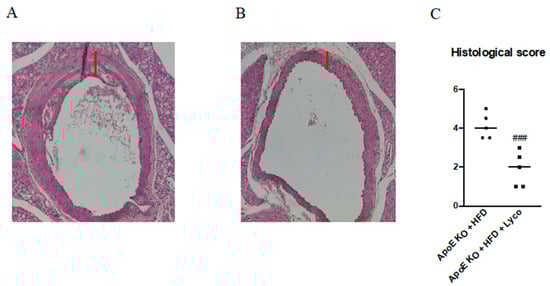Representative H&E images (original magnification 10×) of thoracic aortas from ApoE KO + HFD (A) and ApoE KO + HFD + Lyco (B). The graph in (C) represents the histological score. Values are expressed as the mean ± SD of 5 animals. ### p < 0.0001 vs. ApoE KO + HFD.
