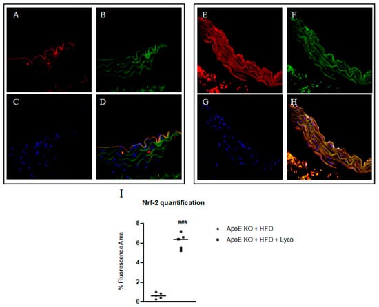 Immunofluorescence staining for Nrf2 (red channel, (A,E)) and CD34 (green channel, (B,F)) in aorta samples of ApoE KO + HFD and ApoE KO + HFD + Lycopene mice. The merge signal shows the co-localization of Nrf2 in CD34+ cells (D,H). Panels (C,G) showed nuclei stained with DAPI. The graph in (I) shows the quantification of Nrf2 expression performed with Image-J. Values are expressed as the mean ± SD of 5 animals. ### p < 0.0001 vs. ApoE KO + HFD.