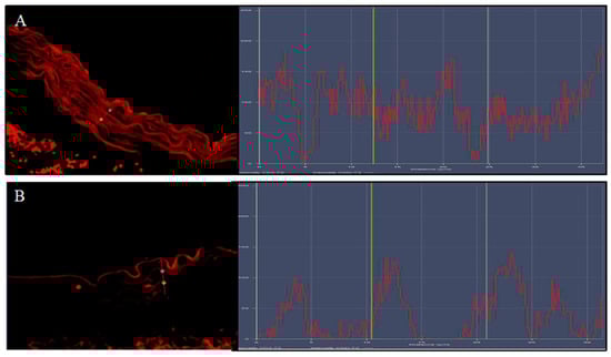 The thoracic aortas of the ApoE KO + HFD group exhibited the rare presence of Nrf2 positive staining (red channel, Figure 4A); the simultaneous labeling of CD34 (green channel; Figure 4B) demonstrated that Nrf2 was expressed in the endothelial CD34+ cells mainly in the tunica intima of aorta, as evidenced by the yellow fluorescence (Figure 4C). The samples taken from the ApoE KO + HFD + Lycopene group showed a significant increase in Nrf2 expression (Figure 4G) in the endothelial CD34+ cells along the tunica intima and media of the aorta compared to the untreated group, as demonstrated by the merge signal (Figure 4H). The display profile obtained by the confocal laser showed a high intensity fluorescence pattern for Nfr2 in the ApoE KO + HFD + Lycopene mice compared to the fluorescence pattern observed in the untreated ApoE KO + HFD mice (Figure 5).