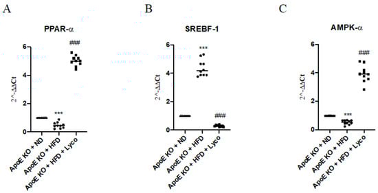 The graphs represent qPCR results of PPAR-α (A), SREBF-1 (B), AMPK-α, and (C) mRNA expression from liver samples. Values were obtained from 10 animals per group and are expressed as the means and SD.*** p < 0.0001 vs. ApoE KO + ND; ### p < 0.0001 vs. ApoE KO + HFD.