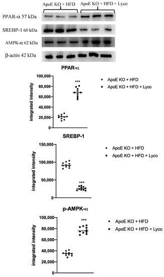 The animals fed with HFD showed a marked reduction of PPARα and AMPK-α mRNA expression compared to the ApoE KO + ND group (p < 0.0001 vs. ApoE KO + ND group; Figure 6A,C). Lycopene treatment caused a significant increase in PPARα and AMPK-α mRNA expression compared to the ApoE KO + HFD group (p < 0.0001 vs. ApoE KO + HFD group; Figure 6A,C). In contrast, SREBPF-1 mRNA expression was significantly increased in the ApoE KO + HFD group compared to the ApoE KO + ND group (p < 0.0001 vs. ApoE KO + ND group; Figure 6B) and reduced following the lycopene treatment in the HFD animals (p < 0.0001 vs. ApoE KO + HFD group; Figure 6B). Similar results were obtained when evaluating the protein expression of PPARα, SREBP-1, and p-AMPK-α using Western blot analysis of the liver samples (p < 0.0001 vs. ApoE KO + HFD group; Figure 7).