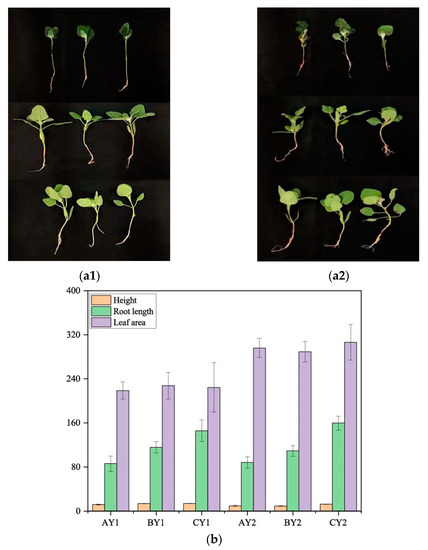Phenotypic map of quinoa under different treatments: (a1) Dian Quinoa 2324 (a2) Dian Quinoa 281. from top to bottom, AY1, BY1, CY1 vs. AY2, BY2, CY2 treatments. (b) Height (cm), root length (mm), leaf area (mm2). Error bars indicate SEs.