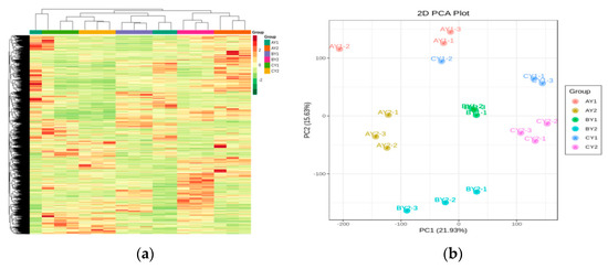 Sample preparation, protein extraction, broadly targeted metabolite identification, and qualitative quantification were performed at Wuhan Metware Biotechnology (Wuhan, China) (http://www.metware.cn/ (accessed on 6 June 2021)). Freeze-dried samples were analyzed using a liquid chromatography–electrospray ionization–tandem mass spectrometry (MS) system (CNWBOND Carbon-GCB SPE Cartridge, 250 mg, 3 mL; Shanghai Ampere Scientific Instruments) based on an in-house Metware database. Metabolite quantification was conducted by multiple-reaction monitoring. A multivariate statistical analysis was used to maximize the retention of raw information. The data were simplified and downscaled to create numerical models for inter-group analyses and to determine associated differences using the built-in statistical prcomp function [18] of the R software (www.r-project.org/ (accessed on 2 July 2021)) [19]. Heat maps were drawn by the R software pheatmap, and the differential accumulation of metabolites (DAMs) between samples was analyzed by hierarchical clustering. OPLS-DA was used to extract the components in the independent variable X and the dependent variable Y, followed by the screening of differential variables [20]. The variable importance in projection (VIP) of the OPLS-DA model for multivariate analysis was obtained and combined with the P-value and fold change to further screen for differential metabolites [20]. Metabolites were considered significant if they differed by a factor of ≥2 or ≤0.5 in the control and treatment groups, respectively. The differential metabolites were further calibrated and annotated in the KEGG database (https://www.kegg.jp/kegg/compound/ (accessed on 22 June 2021)) [21]; their significance was determined using the P-value of the hypergeometric test.