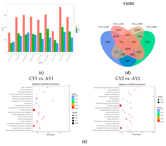 We divided the plants into six groups, AY1, BY1, CY1, AY2, BY2, and CY2, with three biological replicates in each group. In total, 128.05 Gb of clean sequencing data were obtained, with 19–24 Gb per sample, a Q30 score > 91%, and FDR < 0.03% (ab.S1). The genome alignment ratio was >90%, indicating that the data were reliable for a subsequent analysis. We annotated 52,845 genes in total, including 6628 novel genes, 38,129 genes in the KEGG database, 39,959 genes in the GO database, 47,614 genes in the euKaryotic Orthologous Groups (KOG) database, and 38,938 genes in the Pfam database.