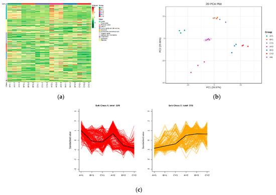 Analysis of metabolome differences in quinoa lines under low-temperature stress: (a) overall cluster plot of samples; (b) PCA plot of metabolites; (c) K-means plot of differential metabolites.