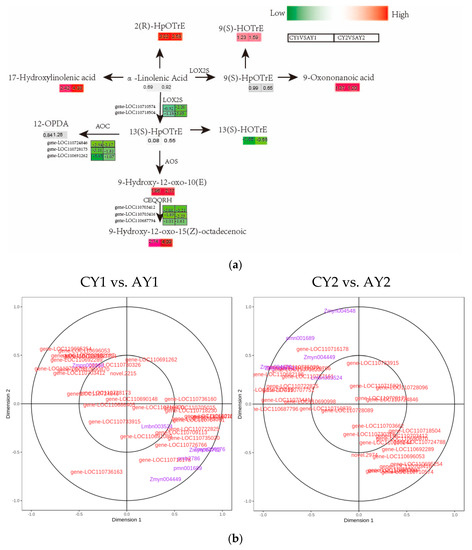 Comparative analysis of α-linolenic acid metabolism and related genes under freezing stress in quinoa. (a) Key metabolic pathways of α-linolenic acid during freezing in quinoa: gene expression levels are expressed as FPKM values followed by calculation of log2FC for different controls, and metabolite levels are expressed as log2FC values for different controls. LOX, lipoxygenase; LOS, hydroperoxide dehydratase; LOC, allene oxide cyclase; (b) metabolites of α-linolenic acid metabolism and the CCA of the gene, with metabolite index (purple) and gene ID (red).