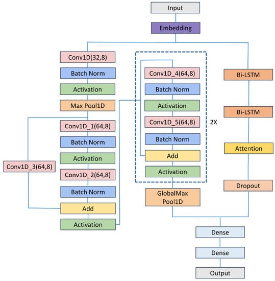 As shown in Figure 1, the proposed method comprised mainly input, embedding, 1D CNN, residual neural network (ResNet), Bi-LSTM, attention, dropout, flattened, and fully connected layers. The input was DNA segments of 200 bp. Then, DNA segments were transformed into number sequences by
