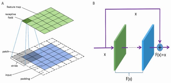 CNN is one of most popular neural network architectures used to construct deep neural network [67,89,90]. The main characteristic of the CNN is to capture the local hidden structure by using convolutional kernels or filters. As shown in Figure 2A, the input is divided into patches, which are convoluted into the feature map by the convolutional kernel. The patches are allowed to overlap, and the interval between adjacent patches is called the stride. All of the patches in the same input share the convolutional kernel which are learnable parameters. To keep the size of the input unchanged, the input is sometimes required to pad. To increase the non-linear ability of the CNN, the activation function is added to the feature map. The activation function includes ReLU, sigmoid, tanh, weakly ReLU, and ELU. The pooling in the CNN is a non-linear down-sampling, whose role is to reduce the dimensionality of representations and to speed up the calculation. In addition, the pooling is able to avoid or decrease the over-fitting issue.