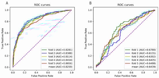 We tested the Enhancer-LSTMAtt for its ability to not only distinguish between enhancers and non-enhancers, but also discriminate strong enhancers from weak enhancers. The process of distinguishing between enhancers and non-enhancers was called the first stage, where all of the enhancers, including weak enhancers, were positive samples. The process of discriminating strong from weak enhancers was called the second stage, where the strong enhancers were positive and the weak enhancers were negative samples. We conducted 5-fold cross validation in dataset S. Figure 4 shows the ROC curve of each fold, and Table 2 lists the evaluation of performance. We obtained an average AUC of 0.8259 in the first stage and an average AUC of 0.6439 in the second stage. We achieved an average SN of 0.7304, an average SP of 0.8006, an average ACC of 0.7655, and an average MCC of 0.5339 in the first stage and an average SN of 0.6765, an average SP of 0.6024, an average ACC of 0.6395, and an average MCC of 0.2804 in the second stage. Obviously, the predictive performance in the first stage was much better than that in the second stage, indicating that it was more difficult to discriminate strong enhancers from weak enhancers than to discriminate enhancers from non-enhancers.