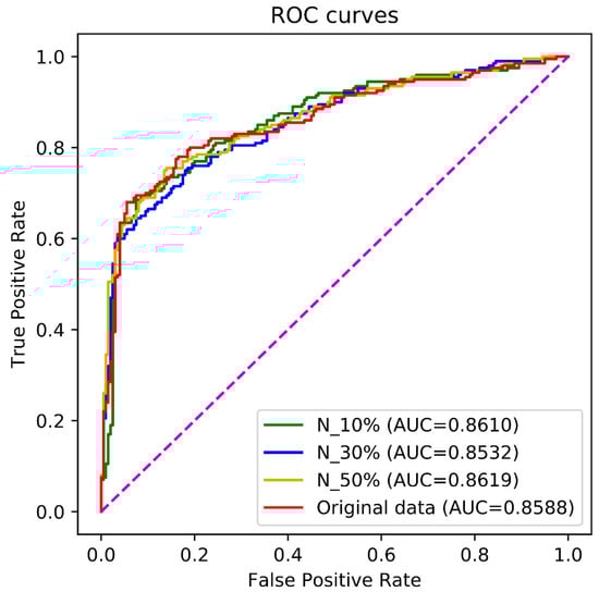The ROC curves by the independent test over different non-enhancer sets. N_10, N_30, and N_50 denote the training sets in which 10%, 30%, 50% of non-enhancers were formed by mutation from the original non-enhancers, respectively. The original data denotes the training set which was made up of the enhancers and original non-enhancers. The purple line is the baseline of ROC curve, named random guessing line.