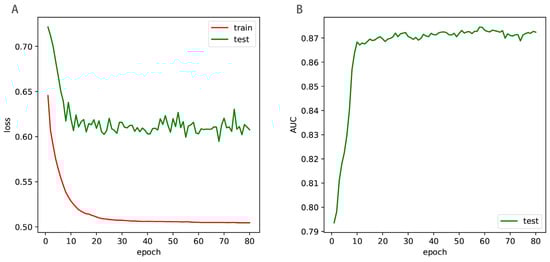 The loss curves (A) and the AUC curve of the independent test (B). The ‘train’ denoted the training loss in the benchmark dataset, and the ‘test’ denoted the loss in the training set and AUC values of the independent test.