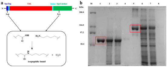 (a) A cartoon of the SpyTag-TAL-SpyCatcher; (b) SDS-PAGE analysis of enzyme proteins: Lane M, protein marker; lane 1, Purified WtTAL; lane 2, culture supernatant of WtTAL; lane 3, cellular soluble fraction of WtTAL; lane 4, cellular insoluble fraction of WtTAL; lane 5, Purified SpyTag-TAL-SpyCatcher; lane 6, culture supernatant of the SpyTag-TAL-SpyCatcher; lane 7, cellular soluble fraction of the SpyTag-TAL-SpyCatcher; lane 8, cellular insoluble fraction of the SpyTag-TAL-SpyCatcher.