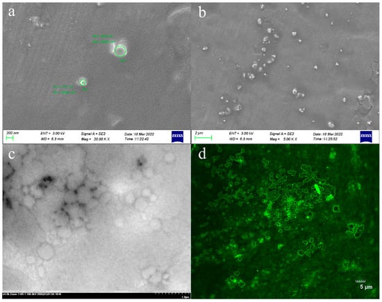 (a,b) SEM images of the TAL-CLEs; (c) TEM images of the TAL-CLEs; (d) CLSM images of the TAL-CLEs.