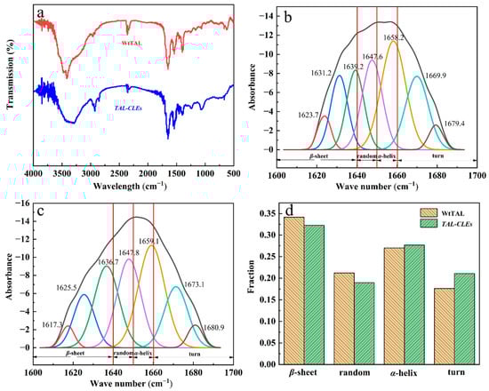 (a) FT-IR spectra of WtTAL and TAL-CLEs; (b) Gaussian fitting infrared spectra of TAL-CLEs (the residual of is 0.692, R2 = 0.979); (c) Gaussian fitting infrared spectra of WtTAL (the residual is 0.299, R2 = 0.990); (d) Comparison of peak areas of different secondary structures of WtTAL and TAL-CLEs.