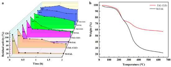 (a) Thermostability of WtTAL and TAL-CLEs; (b) TGA images of WtTAL and TAL-CLEs.