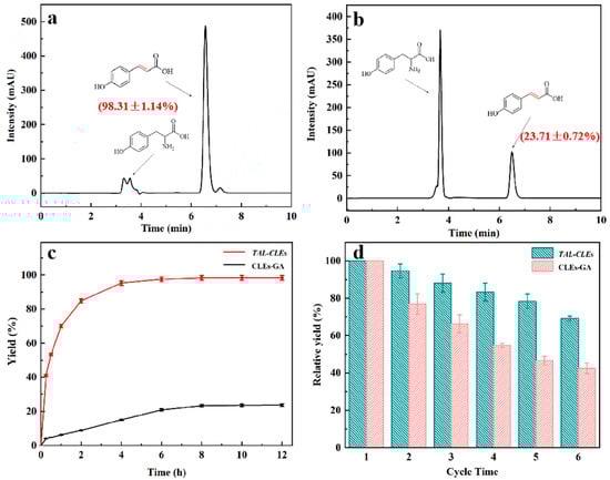 The biosynthesis of p-Coumaric acid using CLEs. (a) TAL-CLEs; (b) CLEs-GA; (c) The mount of p-Coumaric acid changed over time; (d) Reusability of TAL-CLEs and CLEs-GA.