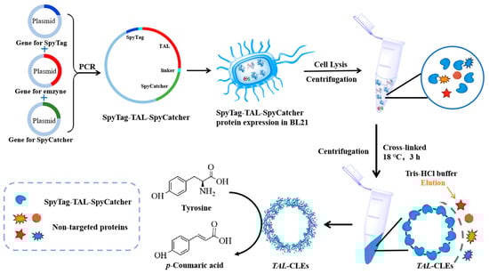 The plasmid pET-28a(+) containing the SpyTag-TAL-SpyCatcher gene was introduced into BL21 competent cells. The engineering bacteria were pre-cultured in a 10 mL Luria-Bertani (LB) medium at 37 °C overnight. Then, a tenth of them were taken out and inoculated into 100 mL LB medium with 50 mg·L−1 kanamycin and cultured in a 250 mL shake flask at 37 °C, 220 rpm. When the OD600 reached 0.8, l-arabinose was added to a final concentration of 10 mM. When the OD600 reached 1.0–1.2, Isopropyl β-d-Thiogalactoside (IPTG) was added to a final concentration of 0.5 mM to induce gene expression. After having been cultured at 18 °C for 16 h [47], the cells were harvested by centrifugation at 8000 rpm for 5 min and resuspended in 50 mM Tris-HCl buffer (pH 8.5). Cells were lysed by ultrasound (25 KHz, 315 W, 10 min) and centrifuged at 12,000× g for 15 min. The bacterial lysates were immediately purified using a Ni column to obtain 1.78 g·L−1 SpyTag-TAL-SpyCatcher protein solution. The wild-type enzyme (WtTAL) with a His-tag on its N-terminal was prepared following the same steps, then stored in Tris-HCl buffer (pH 8.5). Experimental details on the purification process are detailed in the supporting information.