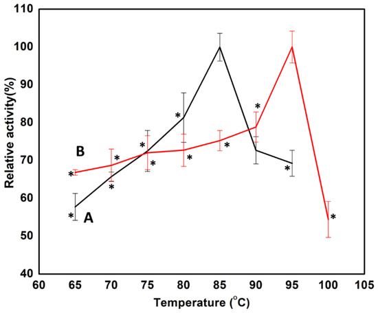 Effect of temperature on the free and immobilized Man/Cel5B activity. (A) Free Man/Cel5B. The temperature values showing significant (p < 0.05) difference from optimum temperature were marked with “*”. (B) Immobilized Man/Cel5B. The temperature values showing significant (p < 0.05) difference from optimum temperature were marked with “*”.