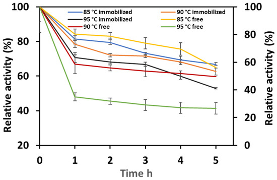 The temperature dependence of free and immobilized Man/Cel5B was studied between 60 and 95 °C. The optimum temperatures of free and immobilized Man/Cel5B were found to be 85 °C and 95 °C, respectively (Figure 2). The immobilized enzyme was therefore further characterized at 100 °C, where it showed a sharp decline in activity. The opti36mum temperature of the immobilized Man/Cel5B was enhanced by 10 °C which reveals that the rigidity of Man/Cel5B increased after immobilization [35]. Similarly, the optimum temperature of α-amylase from Vigna radiata; increased by 10 °C upon immobilization on chitosan beads [36]. The activity of the free enzyme dropped significantly when the temperature increased from 85 °C to 90 °C. Nevertheless, the activity of the immobilized enzyme continuously increased to 95 °C, which reveals that the support provides protecting effect to the enzyme at higher temperatures [37]. A similar effect of immobilization on enzymes was also observed previously [35]. The possible reason for increased optimum temperature of immobilized enzyme may be because of the synergic effect between enzyme and chitosan beads. In addition, the immobilized matrix may be able to provide a suitable micro-environment at an active center for enzyme and substrate interaction and keep its rigid confirmation and function, especially at higher temperatures [38]. However, the extent of effect varies for different support materials used and with the type of interaction established between enzyme and the solid support.