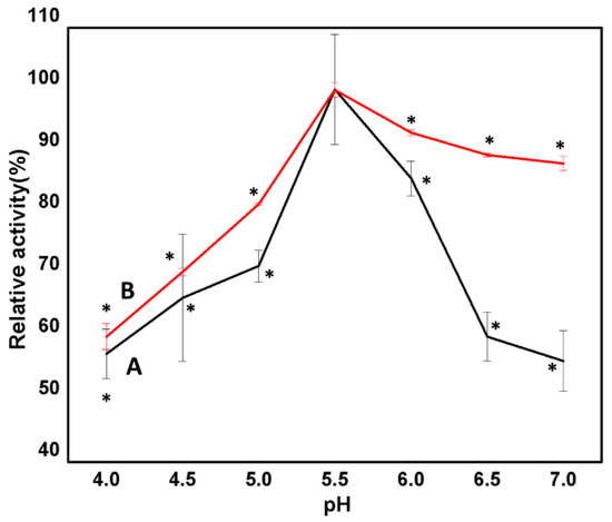 Effect of pH on the free and immobilized Man/Cel5B activity. (A) Free Man/Cel5B. The pH values showing significant (p < 0.05) difference from optimum pH were marked with “*”. (B) Immobilized Man/Cel5B. The pH values showing significant (p < 0.05) difference from optimum pH were marked with “*”.