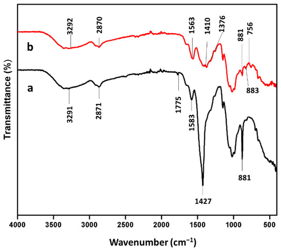 FTIR spectra of chitosan beads and Man/Cel5B immobilized chitosan beads. (a) Chitosan beads. (b) Immobilized chitosan beads.