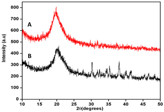 XRD spectra of chitosan beads and Man/Cel5B immobilized beads. (A) Chitosan beads. (B) Man/Cel5B immobilized chitosan beads.
