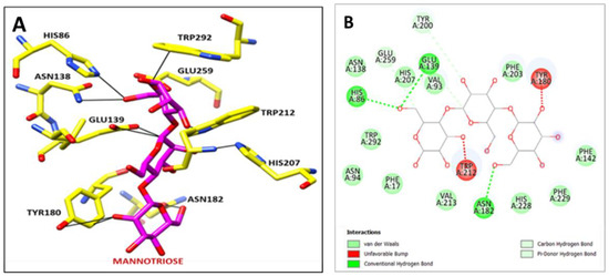 The Psi Ramachandra plot obtained from PROCHECK analysis displayed that 88.20% amino acid residues of Man/Cel5B reside in the most favored region, and 11.80% of amino acid residues in additional allowed regions and no amino acid residue were found in generously allowed or disallowed regions (Figure S1). Further Verify-3D analysis was carried out to check the quality of the predicted mannanase structure. The Verify-3D depicted that the average 3D-ID score of 97.54% of the amino acid residues predicted model of Man/Cel5B is >0.2 which strongly indicates that the predicted structure is of adequate quality. The CASTp analysis showed that the amino acid residues such as Phe17, His86, Val93, Asn94, Lys95, Glu139, Phe142, Gly179, Tyr180, Asn182, Tyr200, Ile201, Phe203, His207, Trp212, Val213, His229, Glu259, Trp292, and Phe298 might play an important role at catalytic site (Figure S2). The molecular docking analysis revealed that the Man/Cel5B structure has strong hydrogen-bonding interactions with the mannotriose ligand (Figure 11). The docked complex showed that there are strong hydrogen-bonding interactions between Man/Cel5B active site residue His86 and mannotriose (BMA 1.C O6) by interatomic distance of 2.6 Å (Figure 12A,B; Table 3). Similarly, Glu 139 (A OE1) interacts with mannotriose (BMA 2.C C1:) by interatomic distance of 2.7 Å. Additionally, the docked complex showed strong hydrogen-bonding of active site residues such as Tyr180, Asn182, His207, Trp212, Glu259, and Trp292 with mannotriose. Hence form this docking of β-mannanase with mannotriose showed very strong hydrogen-bonding interactions with mannotriose ligand.