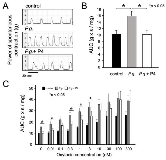 The effects of progesterone (P4) on uterine contraction and oxytocin sensitivity. (A) After a stable response was obtained, spontaneous contractions were measured. Uterine contractions were recorded with a force transducer, and the power was determined by calculating the AUC (area under the contraction curve) at the final 5 min. (B) The mean AUC of spontaneous contractile activity was decreased by 37% in the Porphyromonas gingivalis (P.g.) + P4 group (n = 6) compared to the P.g. group (n = 8) at day 18.0 of gestation. (C) Mean AUC values for uterine contractions induced by various oxytocin concentrations. Oxytocin was added to the tissue organ bath at 20 min intervals in increasing concentrations from 1 pM to 300 nM. Experiments were performed in duplicate using 6–8 independent tissue samples. Statistical analysis was performed using the Mann–Whitney U test. Statistical significance was set at *: p < 0.05. Values represent mean ± SD (n = 6–8).
