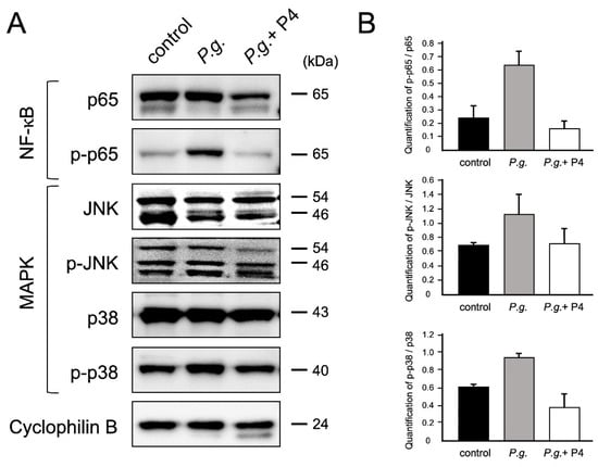 We confirmed how P4 administration altered the NF-κB and MAPK pathways activated in the fetal membranes of the P.g. mice. Western blot analysis was performed to detect phosphorylated NF-κB p65, pJNK, and p38 MAPK, and activation of these proteins was suppressed by 76%, 38%, and 60%, respectively (Figure 2). Suppression of the NF-κB and MAPK pathways in the fetal membranes was assumed to decrease the gene expression of inflammatory cytokines.