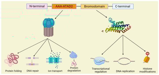 The biological functions of ATAD2 extend far further than this. Similar to most AAA+ superfamily members, the ATPase domain of ATAD2 has an important role in the oligomerization of proteins and is in charge of the binding and hydrolysis of ATP. ATAD2 hydrolyzes ATP by the nucleophilic attack on phosphorylated adenosine, breaking high-energy phosphate bonds, converting ATP into ADP and free inorganic phosphate, and releasing a large amount of energy [,]. The energy provided promotes various cellular processes necessary for life (Figure 1), including protein folding [], intracellular transport [], protein degradation [], DNA repair [], DNA remodeling [], and ion transport [], which has broad biological implications. Notably, ATAD2 is usually required to assemble into hexameric ring complexes during the energy-dependent remodeling of biomacromolecules in cells []. In addition, ATAD2 plays an essential role in the formation of higher-order chromatin structures. ATAD2 hexamers can act as scaffolding proteins that guide the construction of higher-order chromatin structures by bringing nucleosomes into close proximity, and the formation of higher-order chromatin structures requires tight regulation of acetylation and deacetylation, a process that ATAD2 may regulate by competing with histone deacetylase 1 (HDAC1) [,]. ATAD2 also controls the dynamics of histone chaperone and chromatin interactions, particularly the histone chaperone HIRA. ATAD2 deletion would significantly reduce histone chaperone and chromatin interactions, causing an accumulation of histone chaperones at the active gene transcription start site, which leads to a disruption of the nucleosome assembly–disassembly balance, resulting in a net increase in nucleosome assembly [].