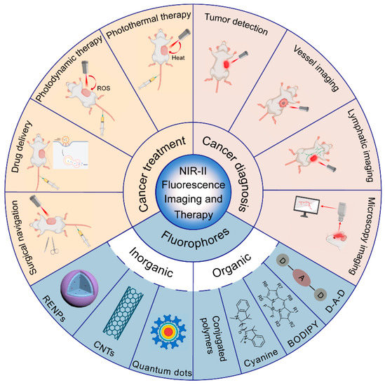 Summary of the categories of NIR-II fluorophores and applications for NIR-II fluorescence imaging in cancer diagnosis and therapy (created with BioRender.com, accessed on 27 July 2022).