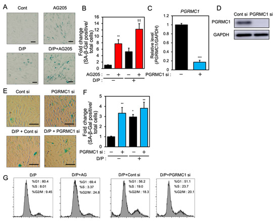 In order to examine the role of PGRMC1 in cellular senescence in decidualizing ESCs, we evaluated the effects of a PGRMC1 inhibitor, AG-205, that blocks PGRMC1 action [29,30,31], and the knockdown of PGRMC1 on SA-β-Gal activity in db-cAMP and P4 (D/P)-treated decidualizing cells (Figure 1). The ESCs were pre-treated with AG-205 or siRNA and then stimulated for 2 days with D/P. The SA-β-Gal activity increased in D/P-treated decidualizing cells (Figure 1A,B). AG-205 treatment increased the number of SA-β-Gal-positive cells compared with the number of control cells (Figure 1A,B). Treatment with AG-205 enhanced SA-β-Gal activity in the D/P-stimulated decidualizing cells (Figure 1A,B). The transfection of PGRMC1-specific siRNA significantly reduced its mRNA and protein expression in ESCs (Figure 1C,D) but increased the intensity of SA-β-Gal staining. The D/P-induced SA-β-Gal staining tended to increase in the PGRMC1-knockdown cells (Figure 1E,F). The cell cycle analysis showed that treatment with AG205 or PGRMC1 siRNA increased the population during the G2/M phase (Figure 1G). These results suggest that PGRMC1 is possibly involved in the senescence of ESCs.