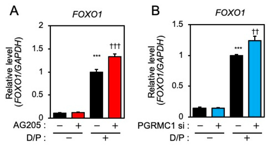 P4 (#P0130), dibutyryl-cAMP (db-cAMP, #D0260), and AG-205 (#A1487) were purchased from Sigma-Aldrich (St. Louis, MO, USA). Antibodies against PGRMC1 (D6M5M) and FOXO1 (C29H4) were obtained from Cell Signaling Technology (Danvers, MA, USA). The antibody against glyceraldehyde-3-phosphate dehydrogenase (GAPDH, clone 5A12) was from FUJIFILM Wako Pure Chemical Corporation (Osaka, Japan).