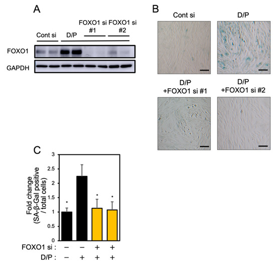 FOXO1 knockdown suppresses decidual senescence in ESCs. ESCs were transfected with FOXO1 siRNA for 1 day and then stimulated with D/P for 2 days. (A) FOXO1 expression was determined by immunoblotting analysis. (B) ESCs were stained for SA-β-Gal. Scale bars = 100 μm. (C) The graph shows the relative ratio of SA-β-Gal-positive cells to total cells. Yellow bars show FOXO1 siRNA transfected groups. Values represent mean ± SEM from three independent experiments. * p < 0.05 vs. D/P.