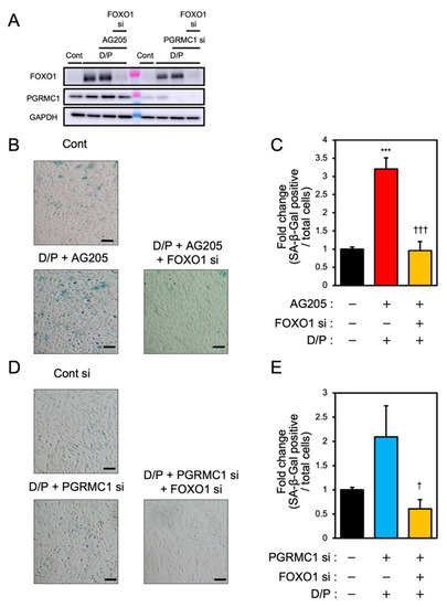 FOXO1 silencing ameliorates PGRMC1 inhibition- and knockdown-induced decidual senescence. ESCs transfected for 1 day with FOXO1 siRNA were treated with D/P in combination with AG-205 or PGRMC1 siRNA for 2 days. (A) Knockdown of PGRMC1 and FOXO1 was confirmed by immunoblotting. (B–D) Cellular senescence was analyzed by SA-β-Gal staining. (C,E) The graph shows the relative ratio of SA-β-Gal-positive cells to total cells. Values represent mean ± SEM from three independent experiments. *** p < 0.001 vs. control. † p < 0.05 vs. D/P + PGRMC1 siRNA. ††† p < 0.001 vs. D/P + AG-205. Scale bars = 100 μm. Red bar: AG205-treated group. Blue bar: the PGRMC1 siRNA-transfected group. Yellow bars: the PGRMC1/FOXO1 siRNA-transfected group.